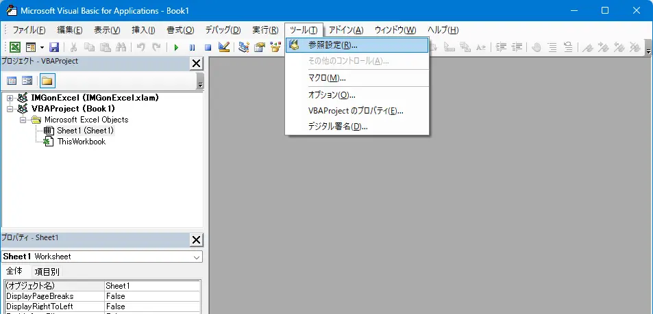 - VBA 画面より、メニュー「ツール」>「参照設定」を選択。